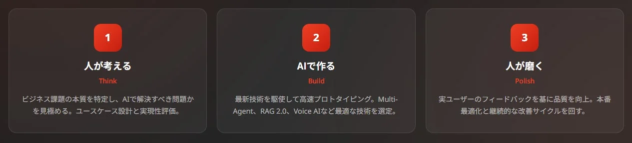 このサービスの差別化要因は、「私たちが考え、AIが構築し、私たちが完成させる」というアプローチにあります。効果的なプロトタイプは、AIによる迅速な生成だけでなく、専門家チームによる深い改善が必要であると考えられています。これにより、「本番運用を見据えた設計」を実現し、多くの組織が直面している「検証段階での停滞」という課題を解決します。