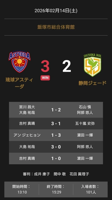 この結果、琉球アスティーダが総マッチカウント3-2で静岡ジェードに勝利しました。会場には101人の観客が訪れ、選手たちの熱い戦いを見守りました。