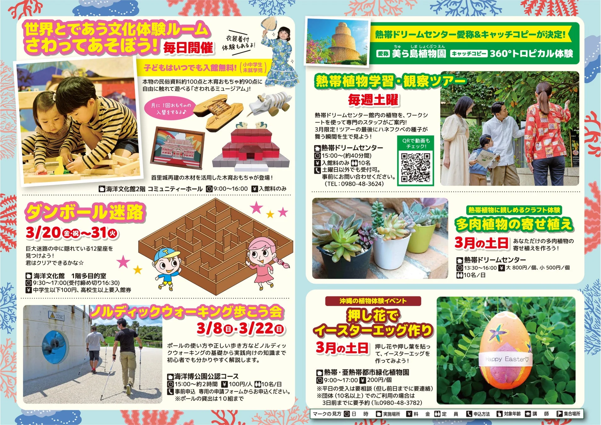 上記のイベント以外にも、多肉植物の寄せ植え体験やウミガメ飼育体験など、家族みんなで楽しめるプログラムが盛りだくさんです。