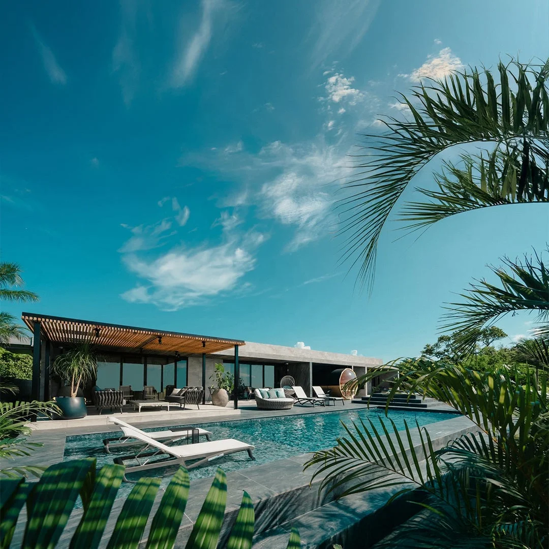 池間島の美しい自然の中に溶け込むように佇む「VILLA AYIN」は、250坪もの広大な敷地に広がる緑と、透明度の高い「池間ブルー」の海に囲まれた完全プライベート空間を提供しています。館内には様々なアート作品が配置され、自然と芸術が融合した独特の世界観を演出しています。
