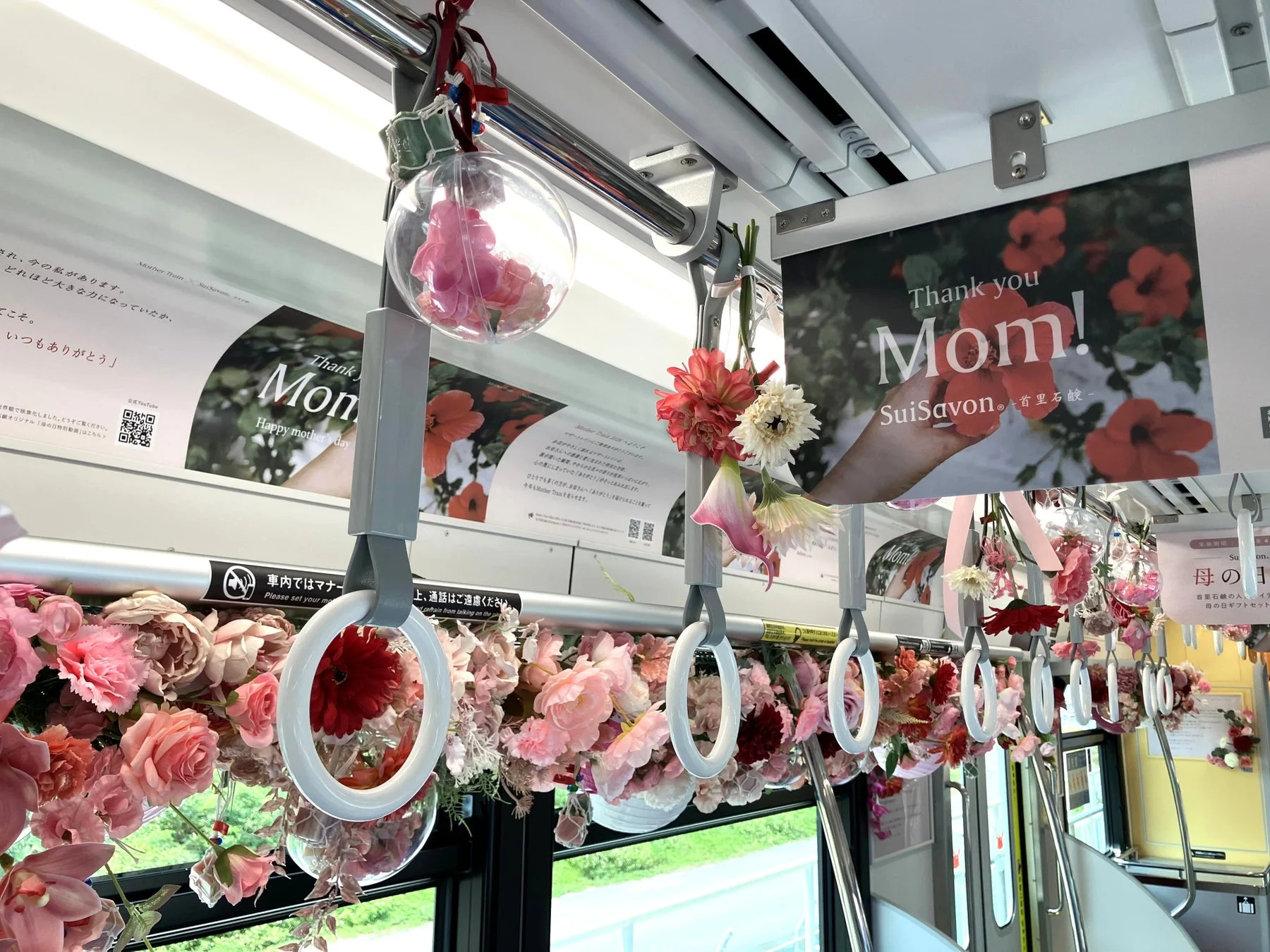 車内には、お母さんへの感謝の気持ちが込められたメッセージが掲出されます。乗車する人々が、お花のデコレーションと石鹸のほのかな香りに包まれながら、日頃の感謝を改めて感じる機会となるでしょう。
