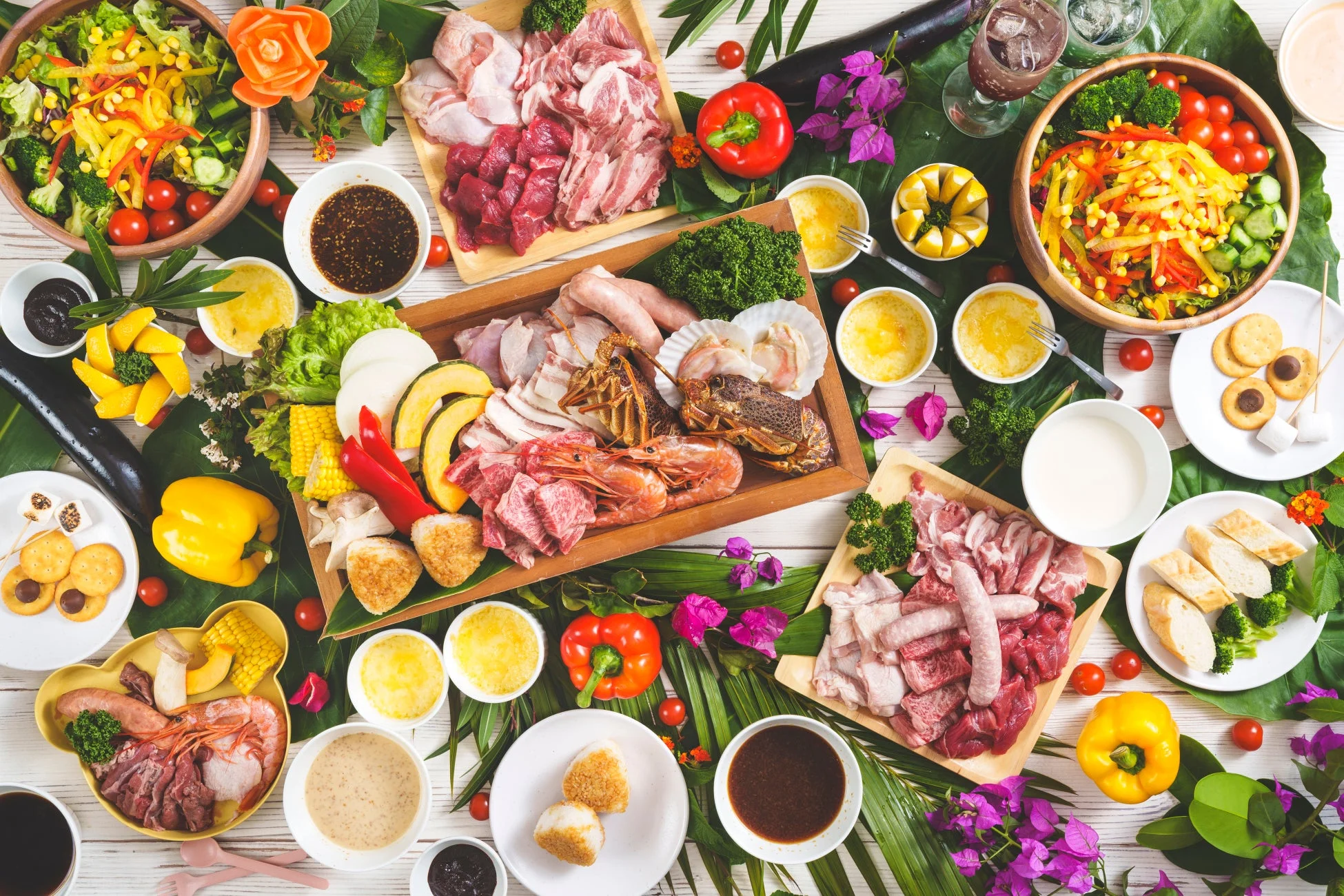 豪華なバーベキュー料理がテーブルいっぱいに並べられた俯瞰写真