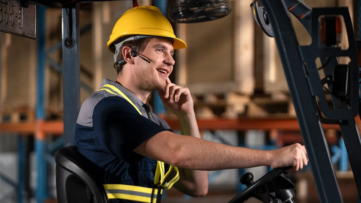 後頭部に掛けるスタイルのため、安全帽や保護メガネなどの個人用保護具との干渉が最小限に抑えられます。軽量で人間工学に基づいた形状は、長時間の装着でも快適さを保ちます。ヘッドセットのPTTボタンを使えば、両手を使うことなく通話操作が可能です。