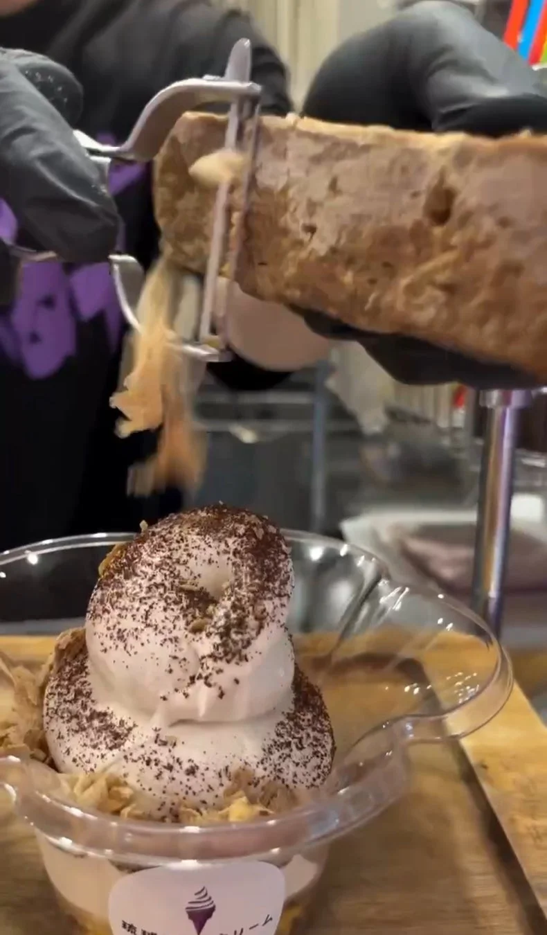 「黒糖生削り」の大きな魅力の一つは、固形の純黒糖ブロックを専用の削り器で目の前で削り上げるパフォーマンスです。削りたてならではの、ふわっとした繊維状の黒糖は、時間が経つと風味が落ちるため、店頭でしか味わえない特別な体験を提供します。この「削るパフォーマンス」は、SNS映えもすることから、沖縄での新しい思い出作りにも貢献するでしょう。