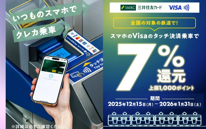 三井住友カードが「全国の対象の鉄道で!スマホのVisaのタッチ決済で7%還元キャンペーン!」を開催