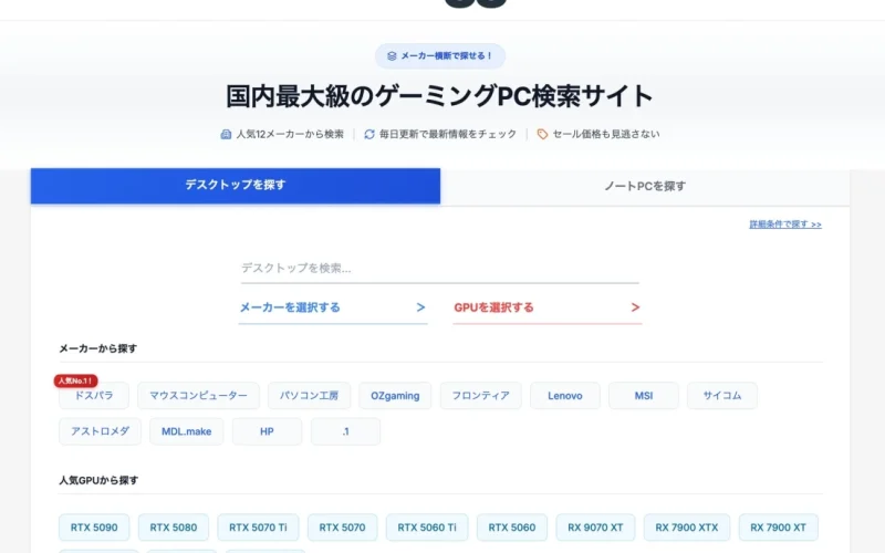 国内最大級ゲーミングPC検索サイト「gg」がトップページ刷新!より直感的に最適な一台を見つけやすく