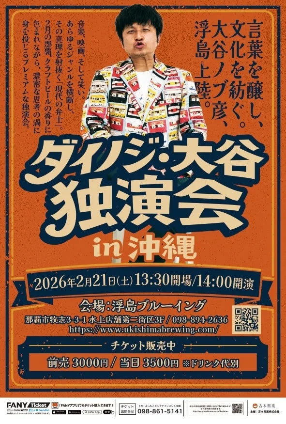 2026年2月21日(土)、沖縄・那覇のクラフトビール拠点「浮島ブルーイング」にて、お笑いコンビ・ダイノジの大谷ノブ彦氏による独演会が開催されます。音楽、映画、社会情勢といった幅広いカルチャーを独自の鋭い視点で切り取る大谷氏が、「現代の弁士」として言葉の力で物語を紡ぎ、観客を深い思考と笑いの世界へと誘います。