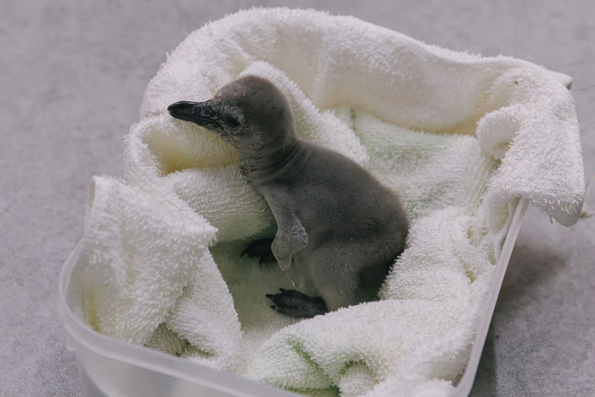 白いタオルに包まれた、ふわふわした灰色のペンギンの赤ちゃんが容器の中でこちらを向いている可愛らしい写真