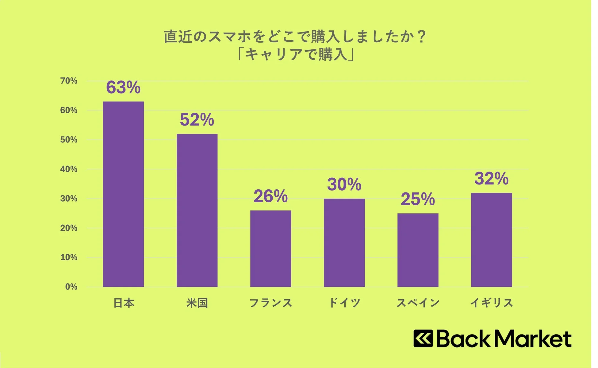 「直近のスマートフォンをどこで購入したか」という問いに対し、日本では63%、米国では52%が「キャリアで購入」と回答しました。一方で、フランス、ドイツ、スペイン、イギリスの欧州各国では、約25%-30%前後に留まる結果となっています。