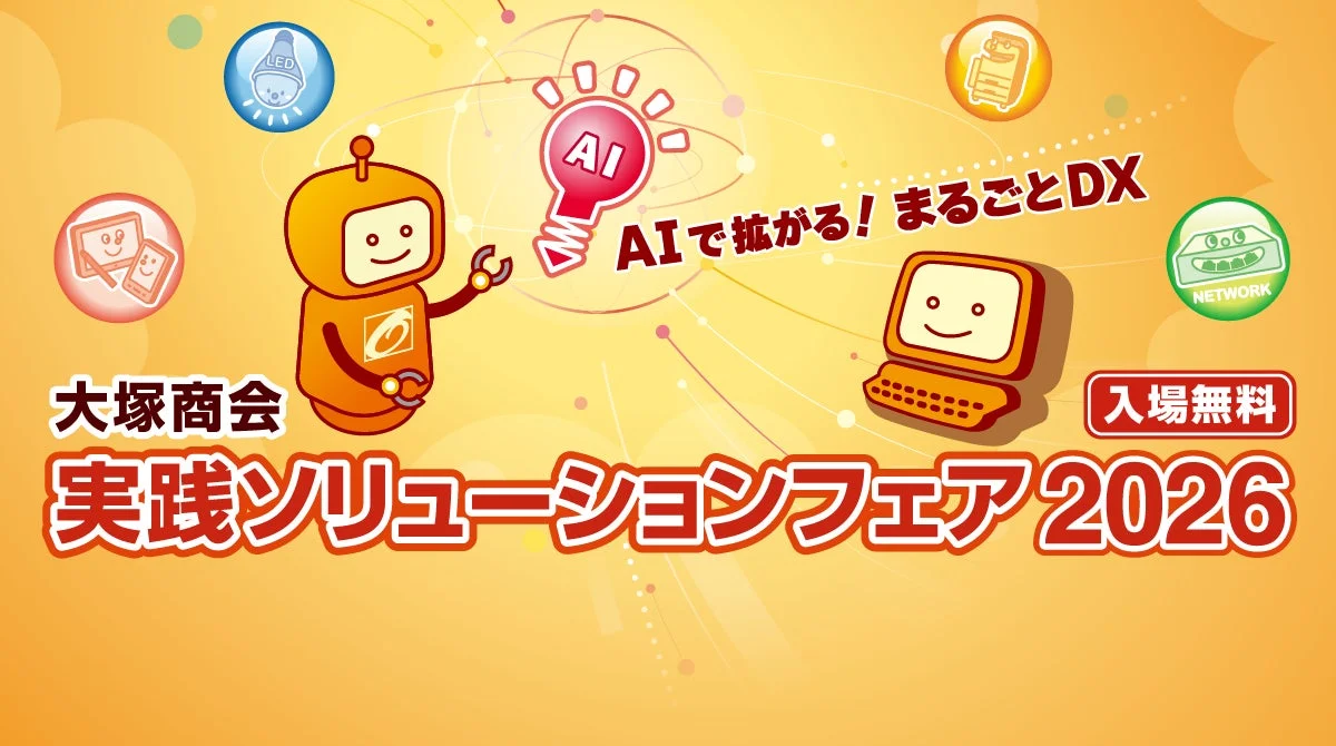 「実践ソリューションフェア 2026」は、大塚商会が開催するIT総合展示会です。今回のテーマは「AIで拡がる!まるごとDX」を掲げ、AIエージェントや生成AIの高度化、ネットワーク・セキュリティ基盤の進化といったIT業界の大きな潮流を踏まえ、大手企業から中堅・中小企業まで、すぐに実践できる「まるごとDX」ソリューションが展示・紹介されます。
