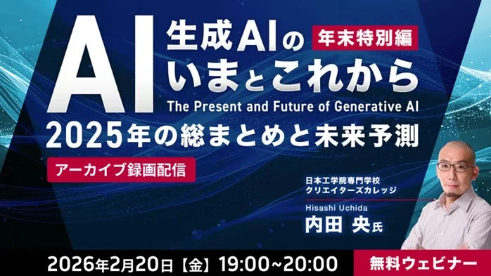 AI 生成AIの 年末特別編 いま とこれから The Present and Future of Generative AI 2025年の総まとめと未来予測 アーカイブ録画配信 日本工学院専門学校 クリエイターズカレッジ Hisashi Uchida 内田 央氏 2026年2月20日 【金】 19:00~20:00 無料ウェビナー