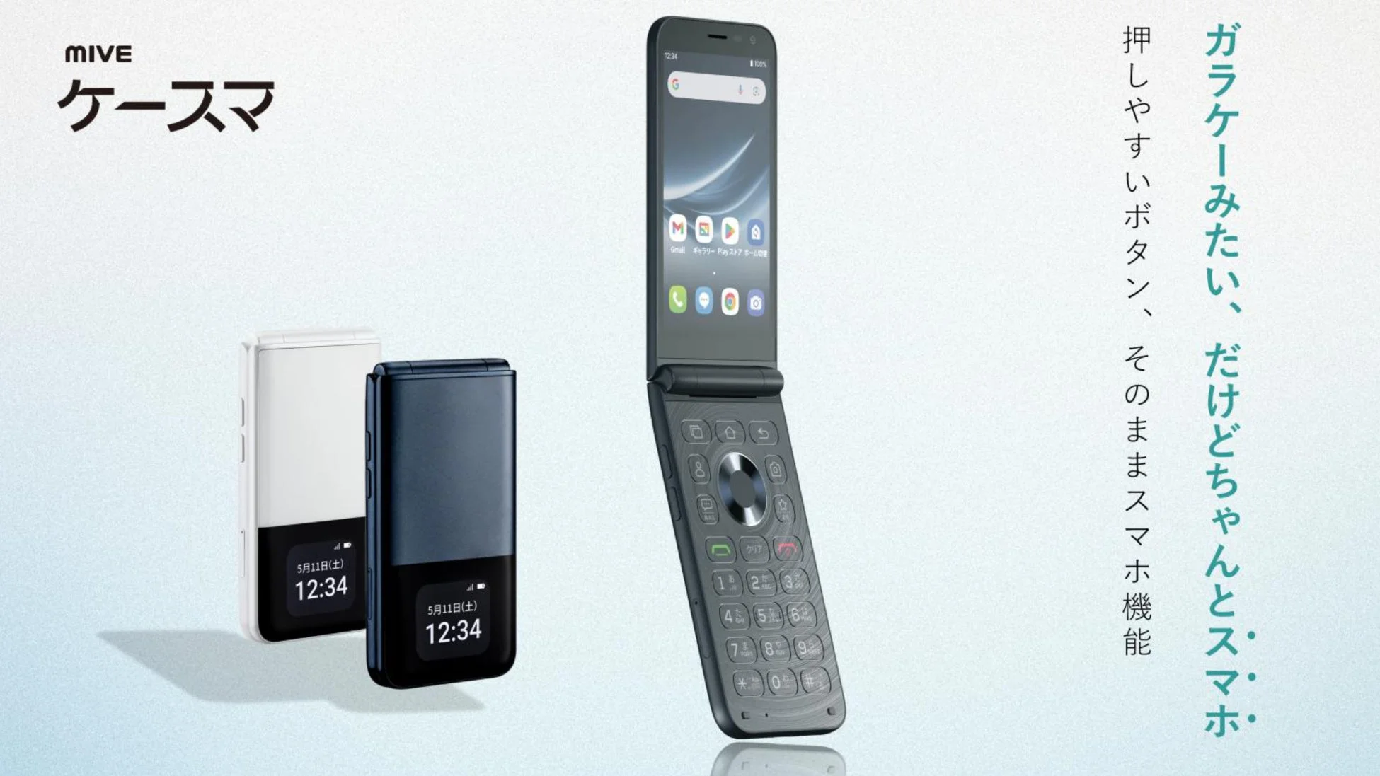「MIVEケースマ」は、物理キーによる操作性とスマートフォンの利便性を両立した折りたたみ型スマートフォンです。従来の携帯電話の操作感を保ちながら、アプリの利用などスマートフォンの機能も活用できる点が大きな特長。スマートフォンへの移行に不安を感じるユーザー層にとって、魅力的な選択肢となるでしょう。