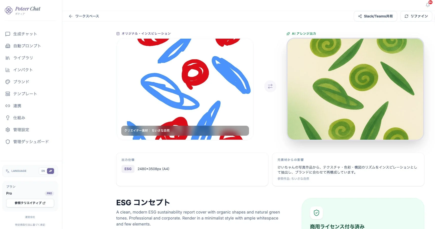 このような背景から、Poteerに蓄積されたクリエイティブ資産をもとに、企業が直接生成・活用できるSaaSとしてPoteerChatが開発されました。
