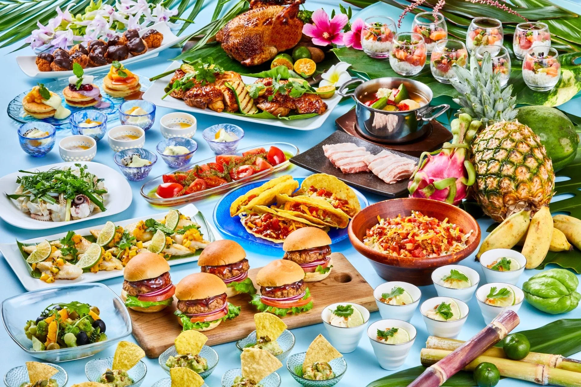 サザンビーチホテル&リゾート沖縄の2階に位置するブッフェレストラン「レイール」。全面ガラス張りの窓の向こうには、エメラルドグリーンに輝く海が広がり、南国リゾートならではの開放感あふれる空間が広がっています。沖縄近海の新鮮な食材や季節の恵みを活かした、和・洋・中のバラエティ豊かなメニューがブッフェスタイルで提供されます。